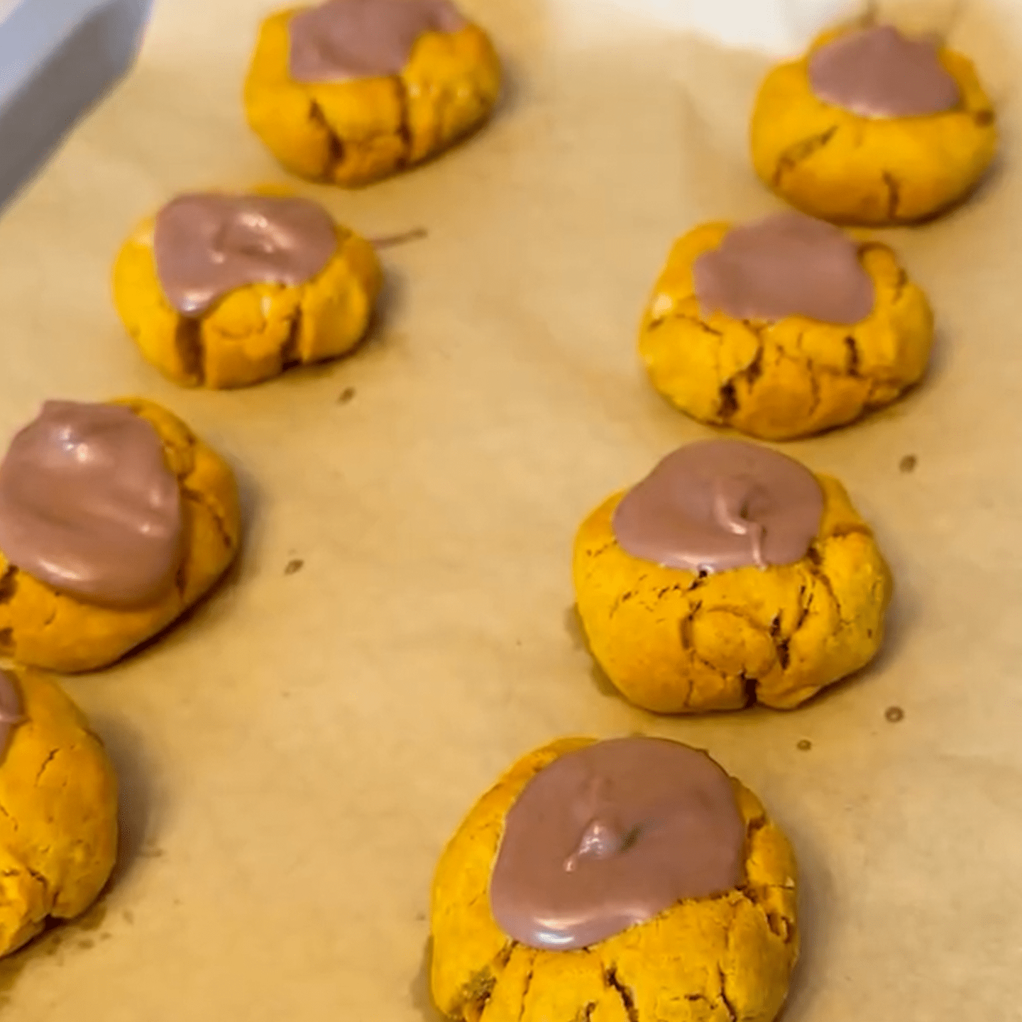 7. Spoon melted carob into each thumbprint center.