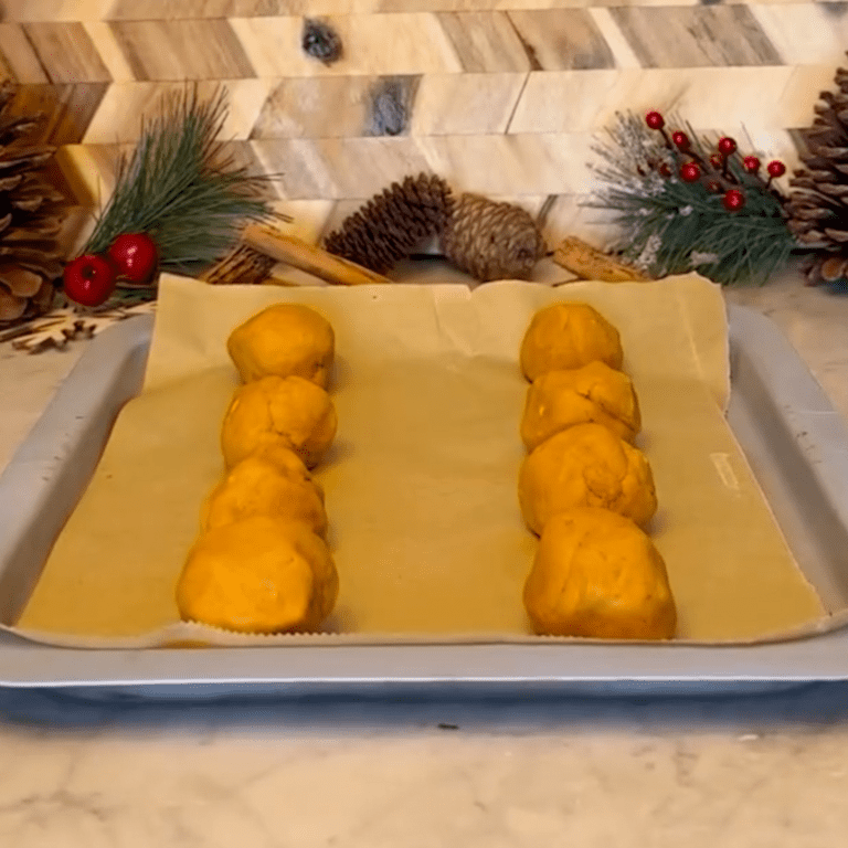 3. Roll dough into 1 inch balls and place on prepared baking sheet.